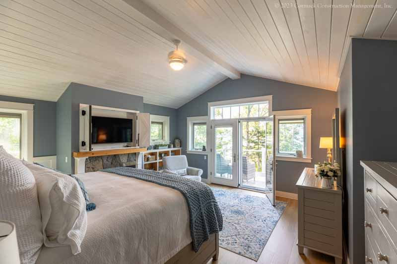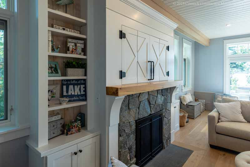 Interior spaces are arranged for both privacy and connection, with an open-concept main living space, custom stone fireplace with a reclaimed wood mantel, and a series of thoughtful built-in elements that maximize functionality. The design balances simplicity and refinement, offering a calm and practical environment for year-round use.
