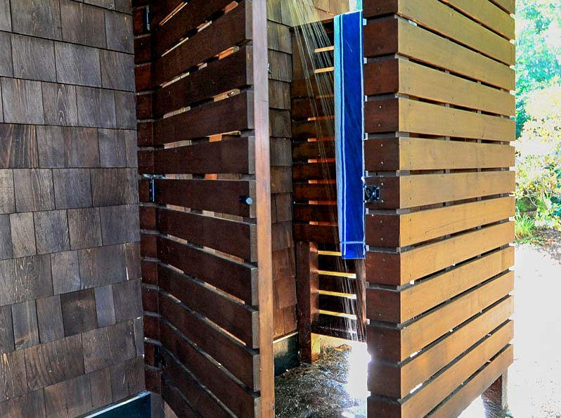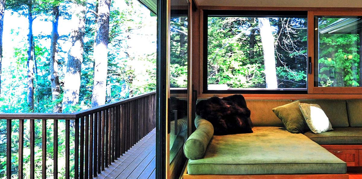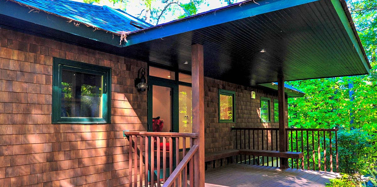 A handcrafted timber entry porch forms the welcoming centerpiece of the renovation. Its exposed beams, natural wood posts, and gracefully arched truss create a warm, expressive threshold that complements the home’s shingle siding and forested surroundings. The new entry feels both inviting and durable, offering an artisanal touch that reinforces the home’s connection to the landscape.